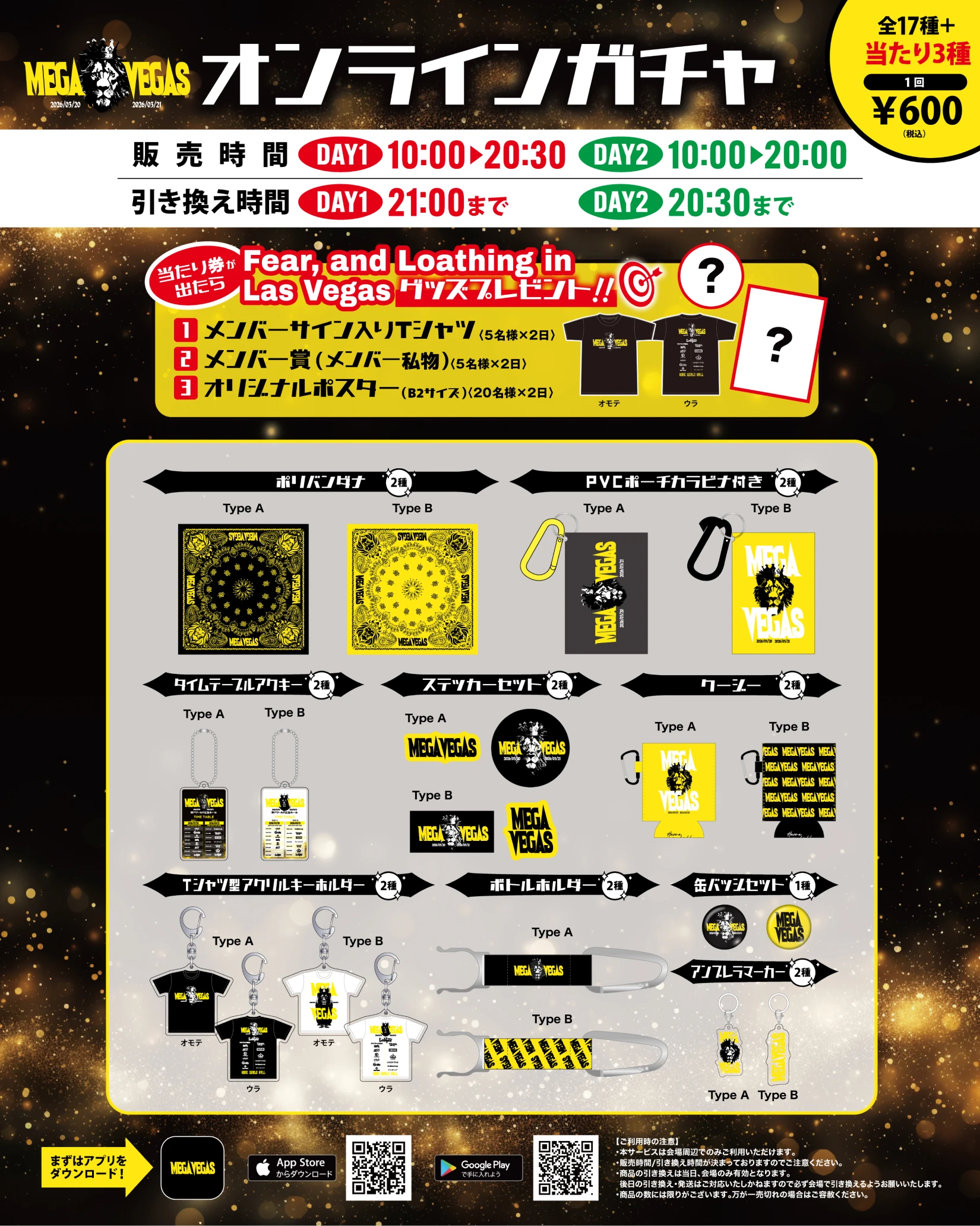 会場限定オンラインガチャの販売が決定いたしました!! 当りには、Fear, and Loathing in Las Vegasサイン入りTシャツ!メンバー私物!オリジナルポスタープレゼント!と豪華特典が! そして、思わず欲しくなるグッズが17種。 ご来場の記念にぜひご利用ください!